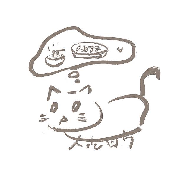 介紹一下手繪的「大吃四方的貓」logo~貓的底下有「大吃四方」構成的腳腳,上頭也有想像中的食物喔~希望大家喜歡